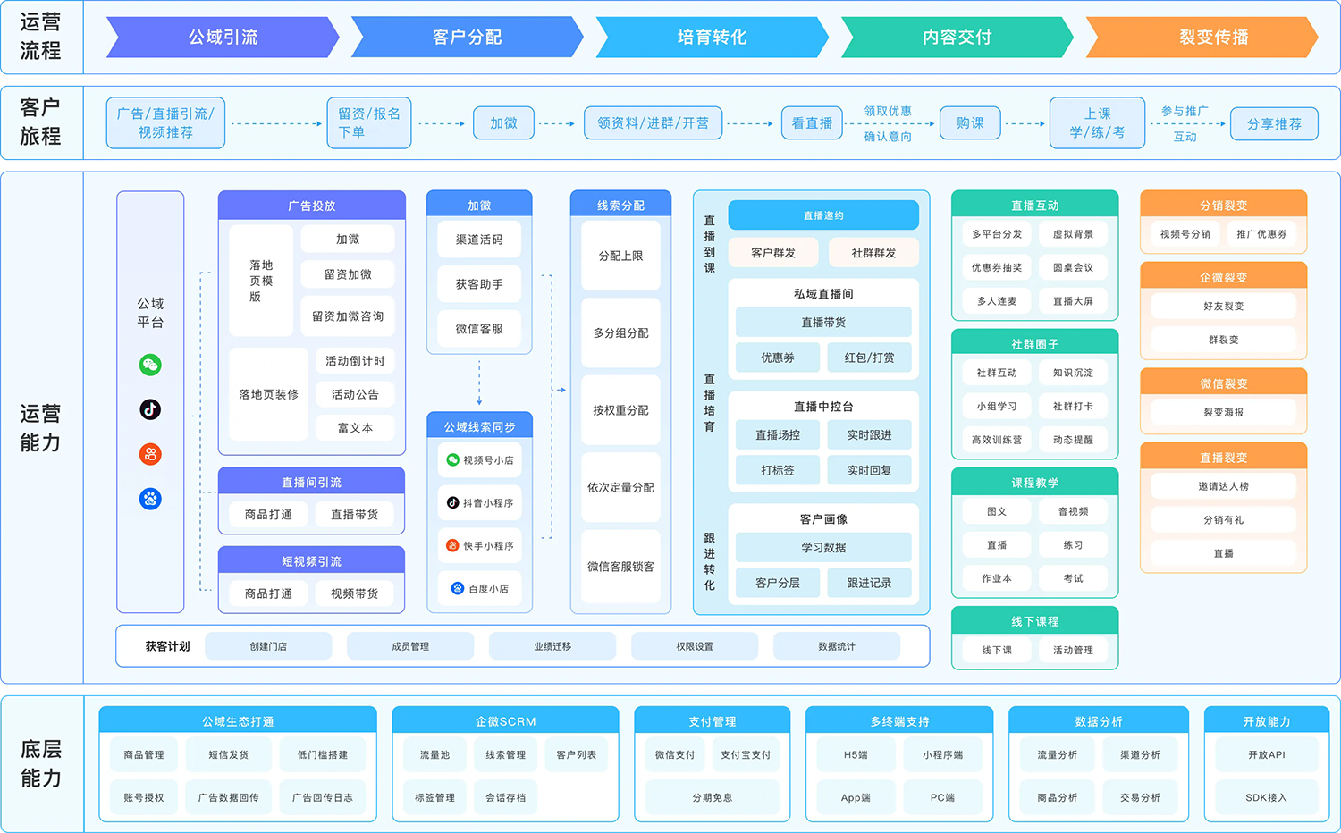 全平台直播分发引流,通过直播转播/邀请达人榜/渠道活码等能力引流到私域
